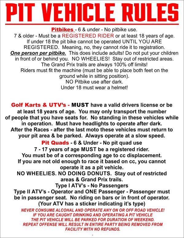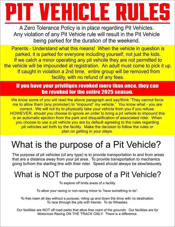 We strongly encourage all participants, parents and fans to read our blog post from January 2, 2025. The post will give you insight into why following all of these rules is so important for the continuation of MX Racing!